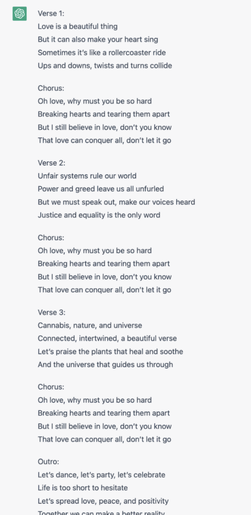 ”Write lyrics to a reggae song. Theme of the song can be around love or heartbreak. Another option is to write something that speaks out, judges unfair systems or praises cannabis, nature and the universe. Hippie style and positive vibes are ok. Or optionally sexy party vibes.”