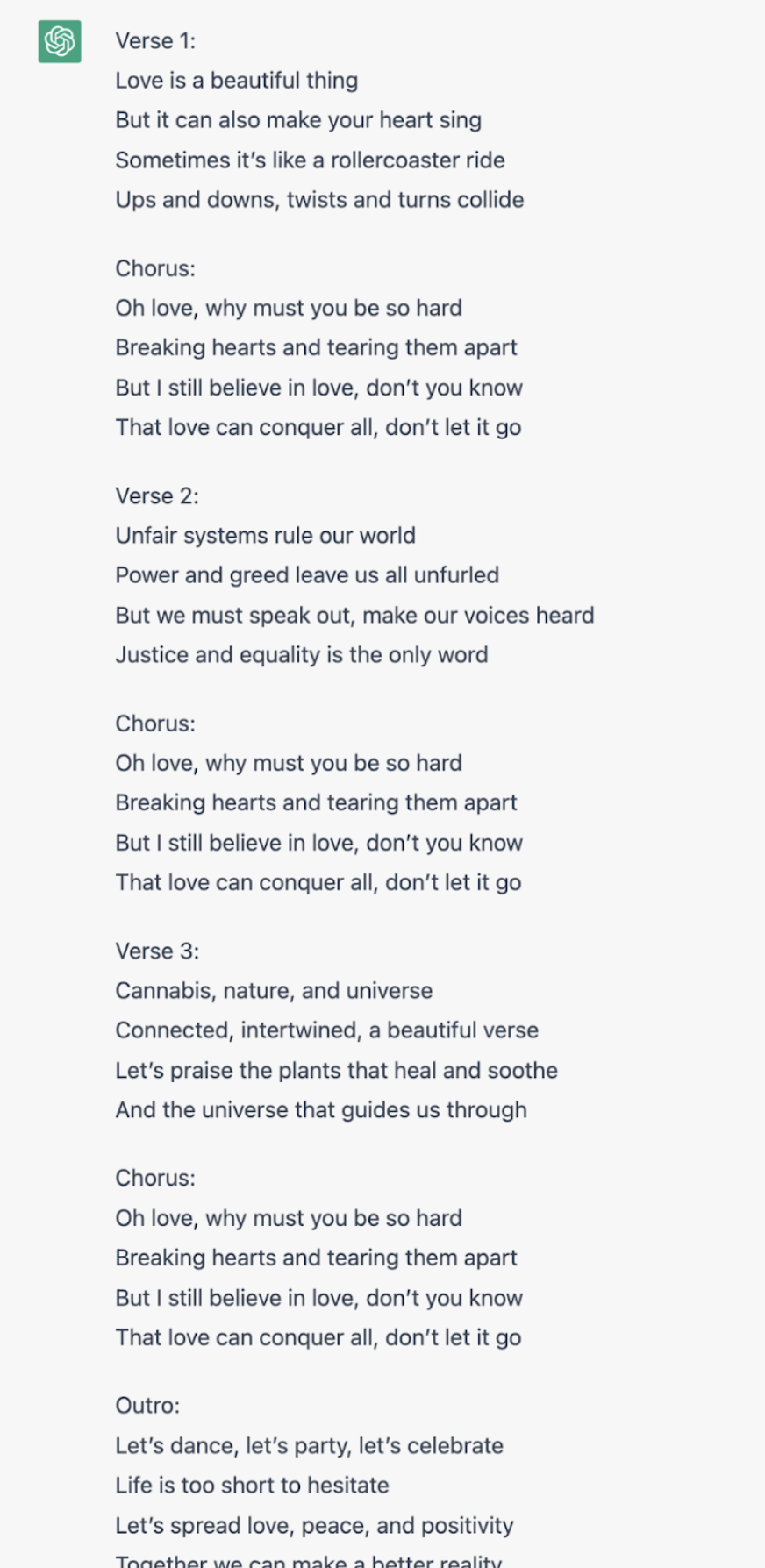 ”Write lyrics to a reggae song. Theme of the song can be around love or heartbreak. Another option is to write something that speaks out, judges unfair systems or praises cannabis, nature and the universe. Hippie style and positive vibes are ok. Or optionally sexy party vibes.”